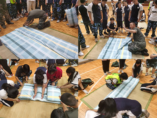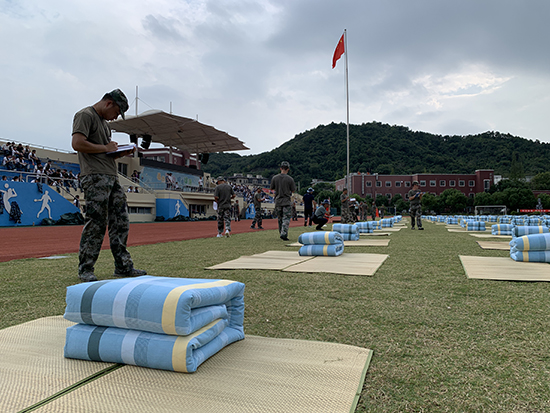 這是一場(chǎng)速度與智慧的較量。比賽分為兩場(chǎng),團(tuán)體賽中,要求每四位同學(xué)團(tuán)結(jié)合作,完成一組作品。每班學(xué)員迅速分成10組,每組成員配合默契,圍在席子四周摩拳擦掌,蓄勢(shì)待發(fā)。隨著“預(yù)備,開(kāi)始!”的一聲令下,選手們一捏一折,動(dòng)作利落嫻熟。最后再由各班排頭的同學(xué)檢查所有作品完成情況。第二場(chǎng)精英賽中,各班參賽學(xué)生兩兩合作,限時(shí)10分鐘,比拼速度的同時(shí)更要保證質(zhì)量。比賽結(jié)束,由教官們組成的考評(píng)組對(duì)各班疊被成果進(jìn)行考評(píng)打分。