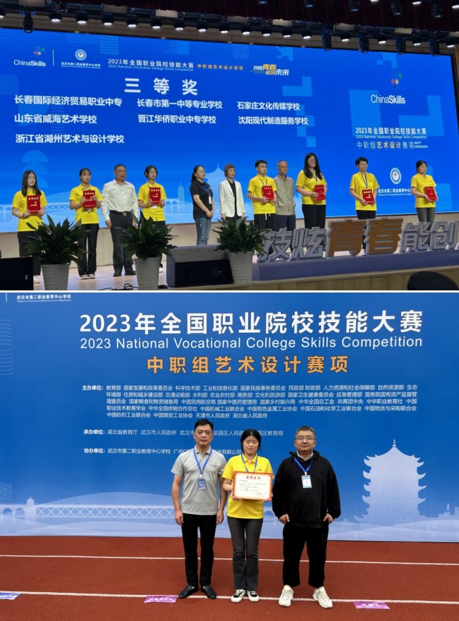 9月19日—9月22日,2023年全國職業院校技能大賽中職藝術設計賽項在武漢市第二職業教育中心學校舉行。浙江省湖州藝術與設計學校團隊(選手:楊欣怡,輔導老師:張曉輝,協助:楊婧,領隊:費永軍副校長)赴武漢參加比賽。此次比賽共有來自全國各省市自治區、計劃單列市的73支參賽隊,藝校選手楊欣怡突破重重困難榮獲三等獎,這也是藝校在職業技能大賽數年蟄伏后的首次亮相。