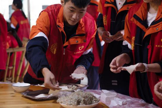 “我們都是吃貨,吃最在行了”,同學(xué)們擼起袖子、洗好手圍在餐桌邊躍躍欲試。包餛飩、洗番薯、做柿餅,似乎是打開了勞動(dòng)的任督二脈,又似乎正如同學(xué)們所說(shuō)“吃最在行”。同學(xué)們的手都閑不下來(lái)。一旁的導(dǎo)游和阿姨直夸“真能干”!