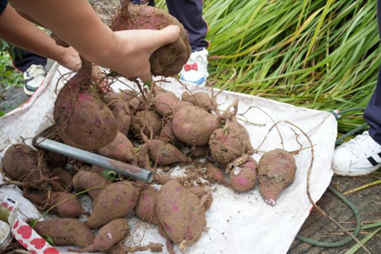 雨后的土地,帶有泥的厚重香。面對(duì)著一片番薯藤脈,同學(xué)們不知如何是好。聽了農(nóng)民伯伯的講解,兩個(gè)男生用力扯藤脈的下端,一連串的番薯被藤脈帶出松軟的泥土,迎來(lái)旁邊女生的連連叫好。接下來(lái)女生上場(chǎng),細(xì)心挖開泥土,露出一個(gè)個(gè)碩大的番薯,那是收獲的快感。