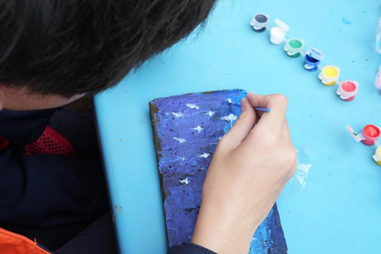 一片片古磚在手,沉淀的是歲月的痕跡。同學(xué)們都想在古磚上留下美好的畫作。留下的是寧?kù)o的星空;是事事如意的柿子;是綠色、粉色的恐龍;是現(xiàn)場(chǎng)綠草地上的黑狗;是調(diào)皮的笑臉……不同的圖案反映不同的心境,歷史在同學(xué)們手下不斷延續(xù),如此美好!