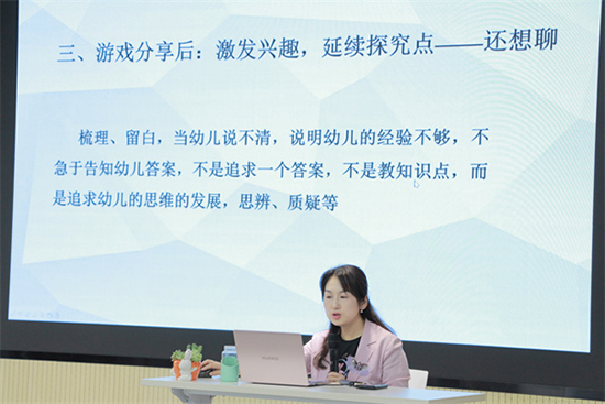 最后,莫老師帶來(lái)了《游戲精神下思維共享活動(dòng)的探究與思考》專(zhuān)題講座。以“什么是思維”“什么是共享”“什么是思維共享活動(dòng)”三個(gè)問(wèn)題為大家詳細(xì)解讀了思維共享活動(dòng)的概念和目的;同時(shí)通過(guò)對(duì)思維共享與集體教學(xué)活動(dòng)的異同點(diǎn)、思維活動(dòng)與談話活動(dòng)的異同點(diǎn)進(jìn)行解讀,用生動(dòng)詳細(xì)的案例分析分享活動(dòng)的現(xiàn)狀以及解讀教師對(duì)思維共享活動(dòng)的困惑。