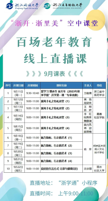 “浙學通”是浙江開放大學以“一網一碼一圖一指數”為終身教育應用框架研發的浙江終身學習公共服務平臺,可以實時推薦附近的繼續教育課程,其擴大了優質教育資源覆蓋面,滿足民眾個性化學習需求。浙江省中醫藥學會、嘉善社區學院、柯橋區齊賢成人文化技術學校、麗水社區大學通過微信群、釘釘等積極發動老年學員線上學習“浙開·浙里美”空中課堂。
