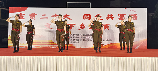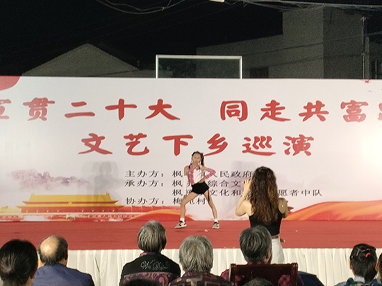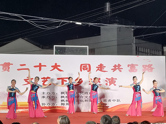 10月4日晚,諸暨市楓橋鎮(zhèn)梅苑村文化廣場上搭起的舞臺(tái)裝飾一新,燈光璀璨,臺(tái)下人聲嘈雜,熱鬧非凡,“楓橋鎮(zhèn)‘宣貫二十大 同走共富路’送戲下鄉(xiāng)文藝巡演”在此演出。