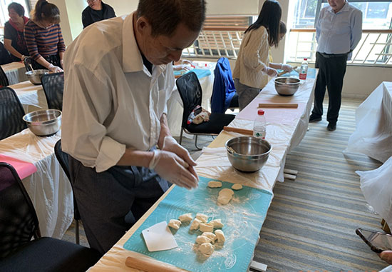 上午,由中式面點(diǎn)金牌大師魏國(guó)民授課,魏老師帶來一款特色肉包子制作,首先他介紹了如何和面,告訴大家要和成光滑的面團(tuán);接著,介紹了如何調(diào)制餡料,要掌握235比例配備。最后一步介紹如何包,取適量餡料置于包子皮上,一手托面皮,一手捏褶子,從頂端逐漸將面皮捏合,直至餡料完全包裹住。出籠肉包子,色澤白亮,大家一致評(píng)價(jià)包子口味好,味道鮮美。下午,安吉百匯大酒店師傅王中亮教大家包秋葉餃子,他采用了理論授課與現(xiàn)場(chǎng)制作相結(jié)合的上課形式。他一邊示范一邊介紹秋葉餃子相關(guān)知識(shí)及注意事項(xiàng)。培訓(xùn)中,王老師時(shí)不時(shí)下到學(xué)員中給予指導(dǎo),由于他的耐心講解,學(xué)員反復(fù)操作,大家基本都掌握了制作流程。