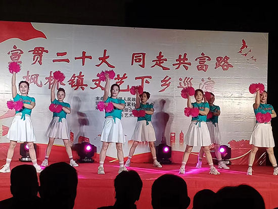 歡快的樂曲聲響起,諸暨市楓橋鎮楓之韻藝術團表演的舞蹈《盛世歡歌》濃裝上臺,明快的舞步、動感的音樂立馬吸引住了村民,紛紛拿起手機拍照。當楓橋老年人太極氣功隊上臺表演時,全場響起了掌聲,老人們英姿颯爽,對襟的黃褂、悠閑的神情、淡定的氣勢,合著音樂的旋律,神清氣閑展示太極的一招一式,手中的養生杖揮灑自如,讓臺下觀眾一飽眼福。“香啊!香啊!幼榧陣陣出榧陰,榧陰山上芳榧披佛遍山林,香榧十里照春水,越中遍是育榧人”悠揚的越歌破空而來,由楓橋鎮楓之韻藝術團謝月美演唱,團長駱幼群編排的《越歌伴舞:香榧吟》隆重登場,掀起了演出的高潮,優美的唱腔、婀娜的舞姿、流暢的動作無不給人以美的享受,鄉音鄉調讓人勾起對家鄉的無限熱愛之情。旗袍秀、爵士舞、越劇、柔力球依序輪番表演,觀眾們紛紛喝彩叫好。最后,全體演出人員齊唱《我和我的祖國》。