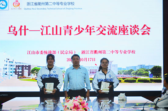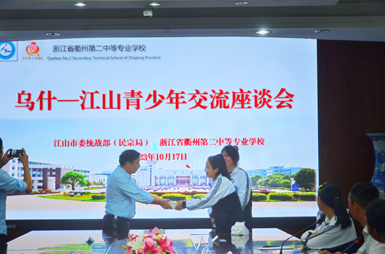 10月17日下午,江山市委統(tǒng)戰(zhàn)部副部長、民宗局局長王向明一行來到衢州第二中等專業(yè)學(xué)校看望來自烏什縣職業(yè)技術(shù)學(xué)校的三名師生,并舉行烏什——江山青少年交流座談會(huì)。