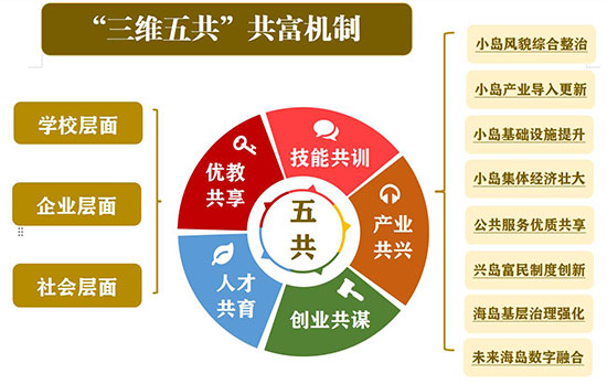 學(xué)校依托浙江省高質(zhì)量建設(shè)共同富裕示范區(qū)背景下,舟山以提升海島人民群眾生活水平和幸福感為導(dǎo)向,實(shí)施的“小島你好”海島共富行動(dòng),針對海島地域分散帶來的資源配置不合理、發(fā)展路徑差異化等現(xiàn)實(shí)問題,通過打造“3+2”海島共富平臺(tái),構(gòu)建“三維五共”共富機(jī)制,提“四域定制”共富服務(wù),將舟山本島的優(yōu)質(zhì)資源,以及學(xué)校的合作網(wǎng)絡(luò)輻射至海島地區(qū),以職教之力助推海島共富,校地合作打造舟山“海島共富”的職教樣板。