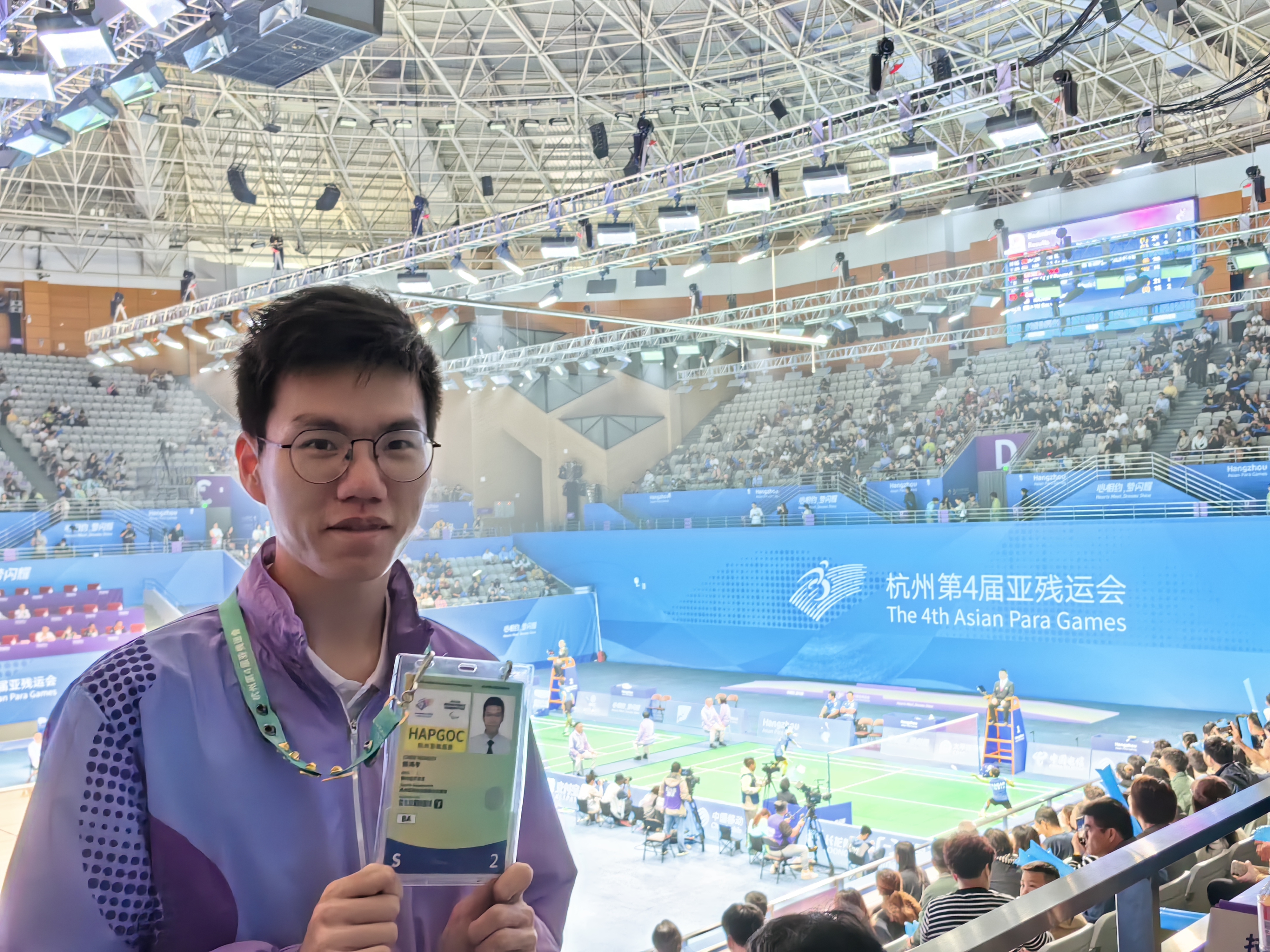 此次參與亞殘運會羽毛球賽事裁判工作,陳鴻宇老師與來自亞洲各國各地區的裁判員和運動員交流經驗,對不同裁判員的執裁風格、特點有了更多了解,也對比賽場館,賽程運行,賽制和比賽項目的安排有了更深認知。
