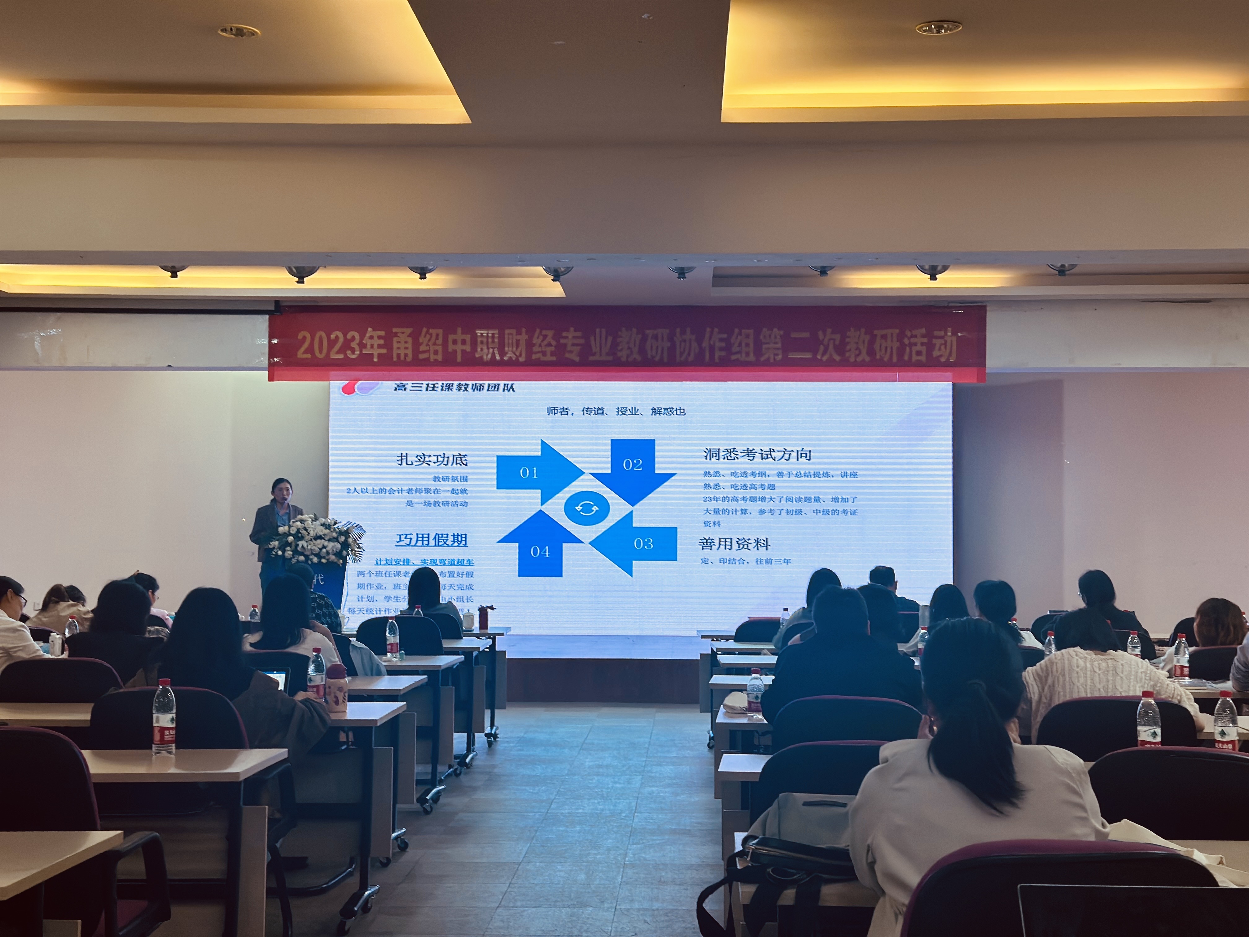 本次教研活動內容豐富,不僅現場有財會專業課堂教學觀摩和高職考復習研討,場外還設有財會專業教師命題比賽和財會專業學生高職考專業理論功底比賽。紹興財經旅游學校作為省內財會專業的王牌學校,近三年一直保持會計專業本科錄取率前三甲成績,此次被特邀做了財會專業高職考復習分享,由會計教研組組長王鈺雯老師做了題為《不忘初心 砥礪前行》的講座。講座干貨滿滿,從“三教改革”出發,多角度,全方位地分析財會專業高職考發展現狀及本校財會專業教育的措施,盡顯師者傳道授業之風。