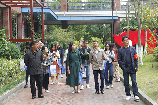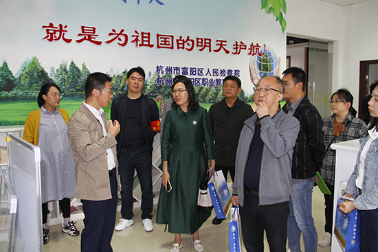 考察團隊一行在富陽區職教中心黨委副書記章文泉,副校長陳建榮、劉著程的陪同下,實地參觀考察了學校實訓樓、中藥陳列館、茶藝室、法制公園、民族文化公園、學生生活區、心理活動站等,深入了解學?;A建設、特色專業建設工作。每到一處,考察組仔細察看學校建設基本情況,不時提出問題,共同探討成效。美麗的職教校園,特別是整齊劃一的跑操給考察組一行留下了深刻的印象。