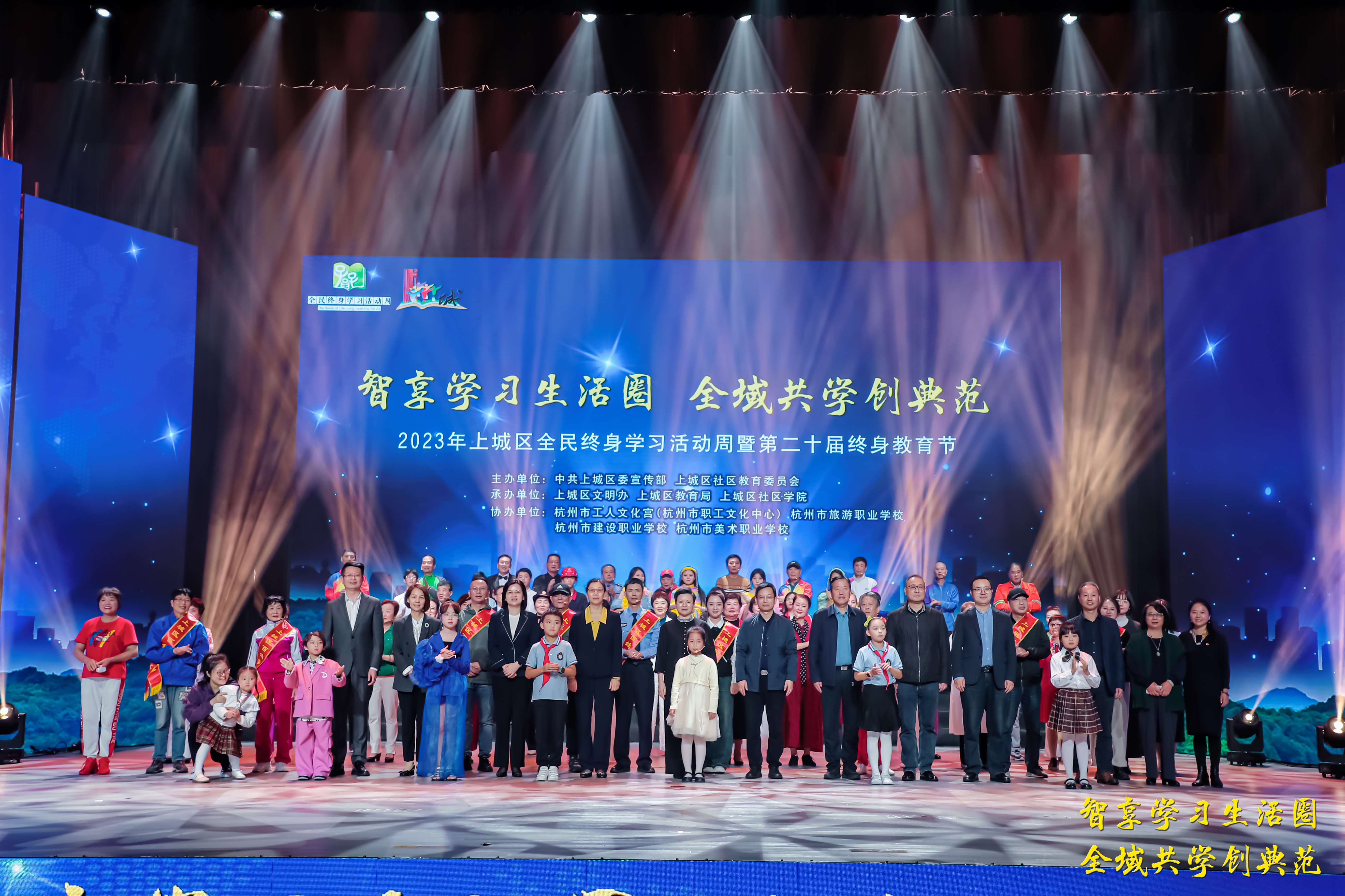 11月10日下午,2023年上城區全民終身學習活動周暨第二十屆終身教育節開幕式在杭州市職工文化中心順利舉行。浙江開放大學校長、浙江省社區教育指導中心主任王正東,杭州市教育局黨委委員、二級巡視員熊群峰,杭州社區大學黨委委員、副校長袁俊,浙江開放大學終身教育處處長虞江鋒,杭州市教育局職成教處處長宋小華,杭州市教育局職成教處副處長張丹,杭州社區大學繼續教育學院黨總支書記蔡吸禮,杭州市教育科學研究院副院長洪彬彬,杭州市工人文化宮黨總支副書記、副主任張建華,上城區委常委、宣傳部部長范衛東,上城區委常委毛素云,上城區人大常委會副主任韋云,上城區人民政府副區長孔德君,上城區政協副主席步漢英,上城區教育局黨委書記、局長項海剛,上城區教育局黨委委員、副局長沈琳出席開幕式。來自區社教委成員單位領導,各社區教育工作者,各類獲獎代表及市民朋友們參與開幕式。