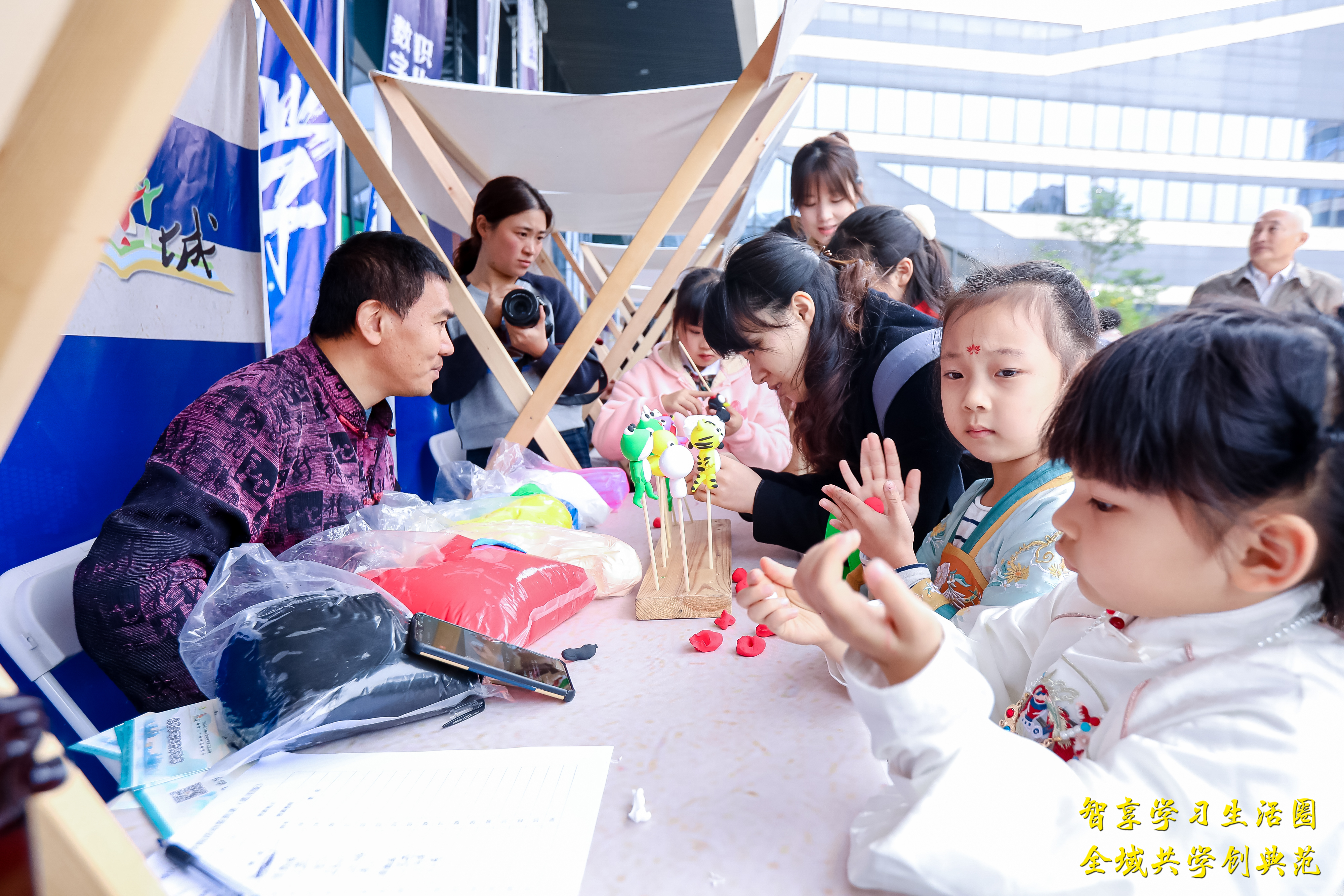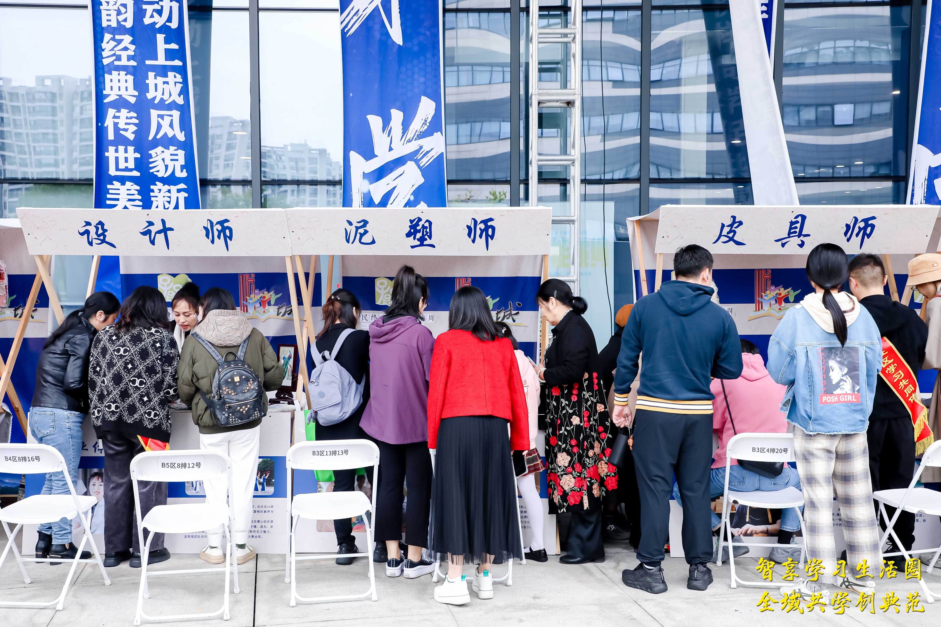 儀式開始前,外場已經人頭攢動。在博學場館體驗區,市民爭相體驗化石翻模、織布體驗、海塘糕體驗、提線木偶、拓印體驗等各種有趣的項目;職業技能學習區則提供咖啡師、茶藝師、糕點師、木雕師等30個社教職業體驗活動供市民自由選擇。