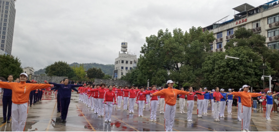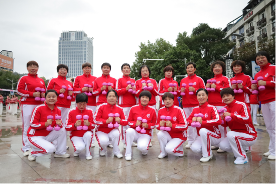 接著,縣退教協、俏夕陽、美好彩虹、城南4個方陣90余人的啞鈴操開始。隨著悠揚的音樂聲,婀娜的身姿緩緩舞動,手持啞鈴的雙手,時而上下移動,時而前后移步,時而輕盈轉體。那一招一式,送往迎來,人鈴合一,得心應手,流暢自如。仙縣巾幗的風采雅韻卻不減當年。啞鈴操是一項健身運動,長期練習,緩解局部疼痛,對人體的各個關節、肌肉以及大腦都能得到不同程度的鍛煉。