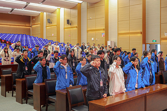 入團儀式在莊嚴的國歌聲中拉開序幕,本次有111名同學光榮加入中國共產主義青年團。新團員們互相佩戴團徽,佩戴上團徽后的團員們看起來個個精神抖擻,胸前的團徽在燈光的照耀下熠熠生輝。隨后,校團委書記帶領新團員宣誓,錚錚誓言,高昂雄渾。青春、奮斗,這是當代中國青年的時代風采,也是行進中的中國動人的旋律。