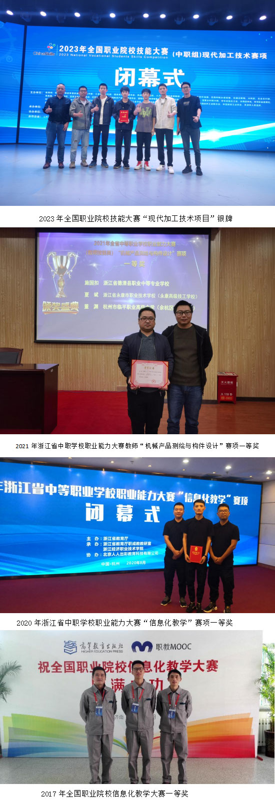 近三年,教師競賽獲全國教師教學能力大賽一等獎2項,省職業能力大賽一等獎3項,省信息化教學項目一等獎1項、二等獎1項,省教師“多彩課堂”評比一等獎1項、二等獎1項等;學生技能競賽累計獲得全國教育部一類競賽一等獎4項,二等獎3項,“現代加工技術項目”代表浙江省隊參加2023年全國職業院校技能大賽,獲得銀牌。(杭州市臨平職業高級中學)
