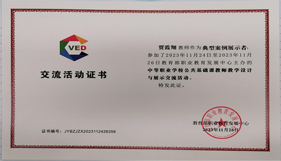 11月26日,2023年全國中等職業(yè)學校公共基礎課教師教學設計與展示交流活動在南京落下帷幕,溫州市龍灣區(qū)職業(yè)技術學校賈霞翔老師表現(xiàn)優(yōu)異,獲得評委一致好評,其參賽作品入選全國中等職業(yè)學校公共基礎課教師教學設計典型示范案例,將由高教社出版,全國推廣。