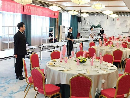 本次賽項突出酒店業(yè)前廳部、餐飲部、客房部三大核心部門主要崗位技能操作的標準性和規(guī)范性。比賽主要包括前廳接待服務(wù)、中餐宴會擺臺與服務(wù)、客房中式鋪床、儀容儀表、專業(yè)理論與專業(yè)英語口試等內(nèi)容。每個隊2名選手隨機抽簽完成“中餐宴會擺臺與服務(wù)”或“客房中式鋪床、前廳接待服務(wù)”項目。抽中“中餐宴會擺臺與服務(wù)”的選手實操需完成工作臺準備、中餐宴會擺臺、席間服務(wù)內(nèi)容,抽中“客房中式鋪床、前廳接待服務(wù)”的選手實操需完成2張床的鋪設(shè)、前廳接待服務(wù)內(nèi)容。
