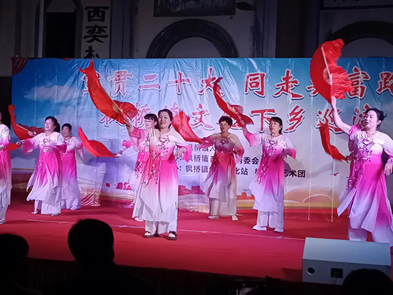 日前,諸暨市楓橋鎮西奕村廣場上熱鬧非凡,魏氏家廟門口搭起的舞臺裝飾一新,“‘宣貫二十大 共走共富路’楓橋鎮文化下鄉巡演”在此舉行。廣場舞、歌曲等不同類型的節目輪番上演,帶給村民無窮的樂趣。