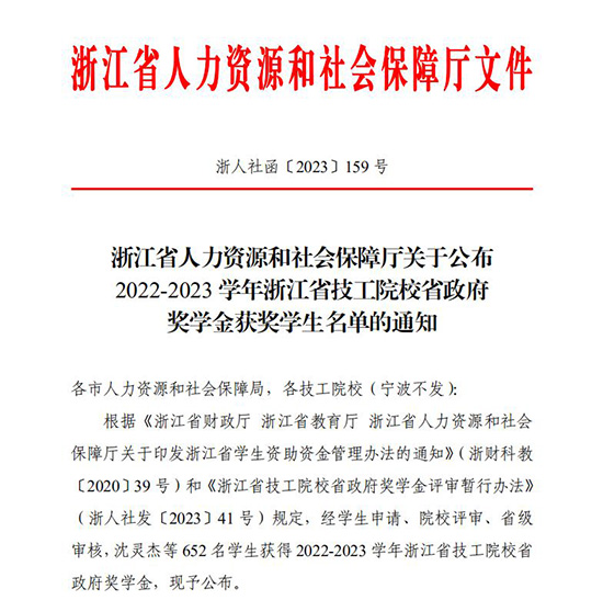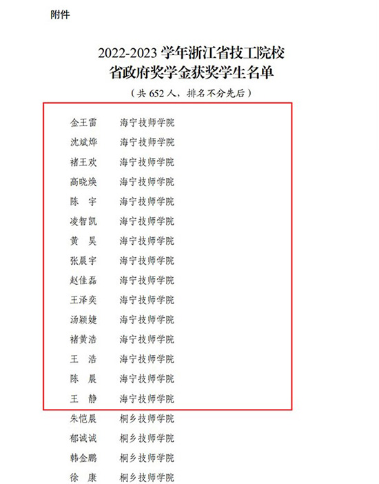 11月24日,浙江省人力資源和社會(huì)保障廳印發(fā)關(guān)于公布2022—2023學(xué)年浙江省技工院校省政府獎(jiǎng)學(xué)金獲獎(jiǎng)學(xué)生名單的通知,全省共有652名學(xué)生獲此殊榮,海寧技師學(xué)院共有15名學(xué)生上榜,每人獎(jiǎng)勵(lì)6000元!