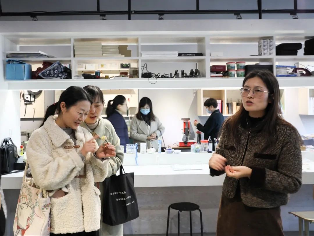 本次參觀路線涵蓋了美育展示廳、品牌營銷+陳列工作坊、湖畔之思工作室、黨建長廊、藝承工作室、實訓長廊、學生事務中心、一爾皮具工作室、匠心坊、工美集裝箱展廳、廉政公園及名師長廊等多個環節。培訓班成員在校辦主任邵曉鳳的詳細介紹下,了解了藝校的校園文化、黨建文化、實訓室建設及教學管理等情況。