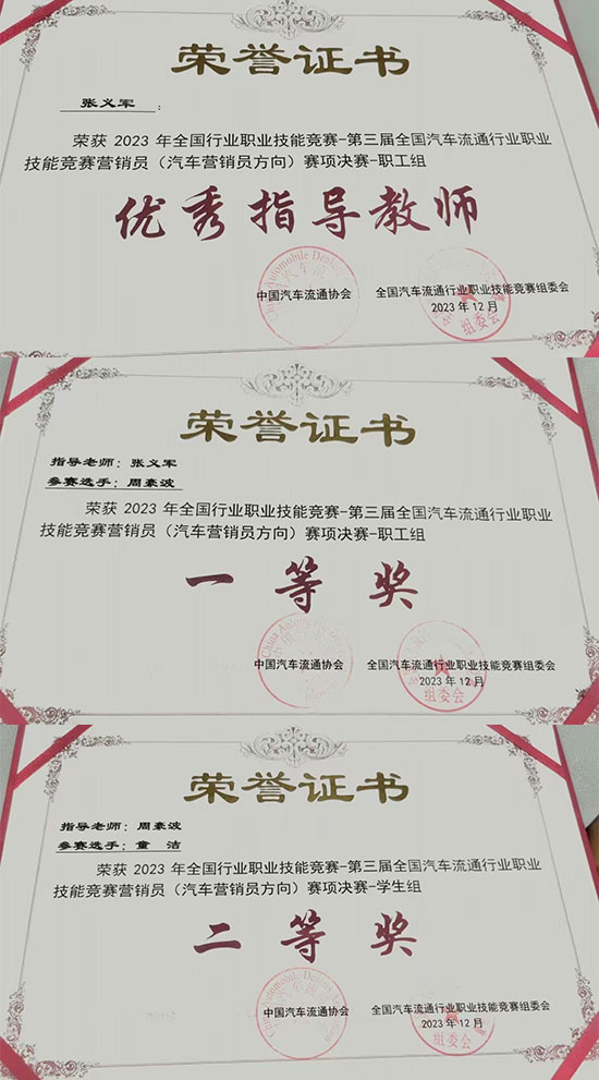 12月3日,2023年全國(guó)行業(yè)職業(yè)技能競(jìng)賽—第三屆全國(guó)汽車流通行業(yè)職業(yè)技能競(jìng)賽營(yíng)銷員(汽車營(yíng)銷員方向)賽項(xiàng)決賽在重慶圓滿收官。嵊州市職業(yè)教育中心代表隊(duì)的張義軍校長(zhǎng)被評(píng)為優(yōu)秀指導(dǎo)教練,周豪波老師獲教師組全國(guó)一等獎(jiǎng),21汽車營(yíng)銷班的童潔同學(xué)獲學(xué)生組全國(guó)二等獎(jiǎng)。