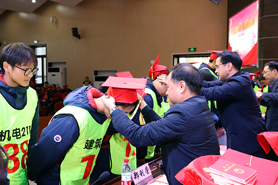 學校領導為班級代表佩戴成人禮帽、成人徽章,贈予《中華人民共和國憲法》讀本,勉勵同學們認真學習憲法知識,提升法治素養、增強公民責任感,在實際行動中踐行憲法精神。