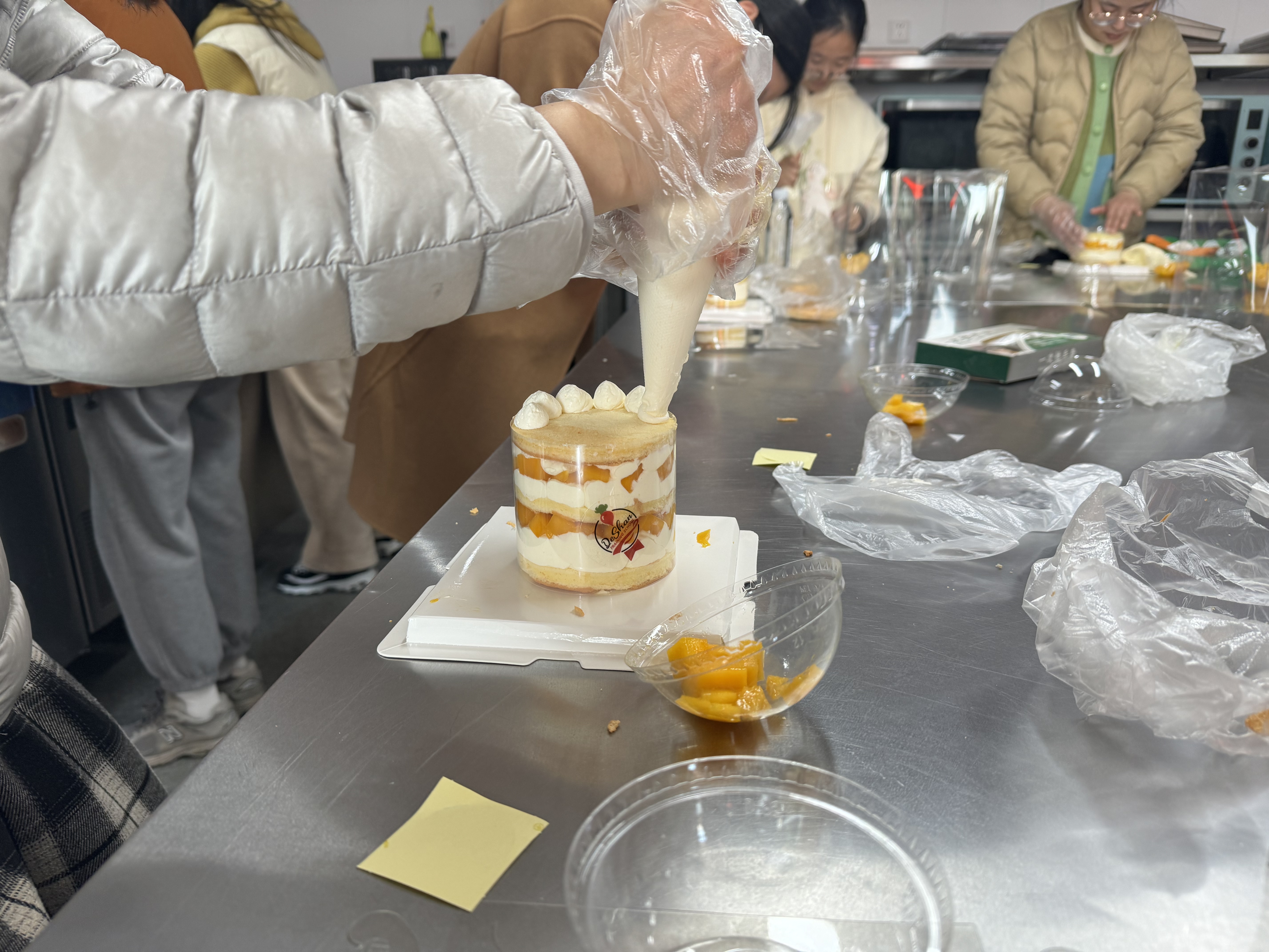 活動開始啦!大家隨意組合三人一組,首先制作芒果蛋糕,烘焙老師向大家介紹了制作芒果蛋糕的所需材料、必備工具、以及包裝的相關知識及操作方法和注意事項,隨后老師現場示范,教授芒果蛋糕的制作,各活動小組在烘焙老師的細心指導下,按照步驟相互分工協作,在圓形蛋糕胚上涂上一層動物奶油、根據個人喜好添加芒果顆粒的數量、再繼續蓋上一層圓形蛋糕胚,在蛋糕胚上方分別涂上奶油和芒果顆粒,重復制作三層,最后在蛋糕表面放上倆片薄荷葉做點綴,一個色香味俱全的芒果小蛋糕就制作完成了。接下去大家又一起合作制作了肉松小貝、紙杯蛋糕、太妃臻果糖等,活動內容豐富,收獲滿滿。