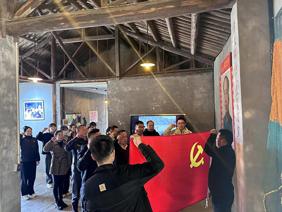 在紅色導覽牌的指引下,大家來到了人民公社舊址。1958年9月,螞蟻島建立起全國第一個人民公社,從此螞蟻島也成為全國農村艱苦創業的典范,豎起中國漁業的一面旗幟。館內還原了人民公社的辦公場景,在導游的講解下,研學團隊的成員們沉浸于當初螞蟻島人民艱苦創業的情景中。毛澤東畫像前,鮮紅的黨旗下,黨員們再次莊重宣誓,重溫入黨誓詞,重憶入黨初心。