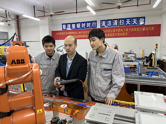 問起技能訓練的訣竅,宋海軍毫不掩飾:“一個字‘練’,熟能生巧,不練是不可能有進步的。”這一點,宋海軍最有發言權。此前,由他指導的諸暨技師學院代表隊分別在2019年、2020年、2021年、2022年連續榮獲“工業機器人技術”賽項的浙江省團體一等獎。最近,由浙江省教育廳主辦,浙江省教育廳職成教教研室、杭州科技職業技術學院承辦的2023年浙江省中高職一體化試點賽“工業機器人技術”項目比賽在杭州科技職業技術學院舉行,經過激烈角逐,代表諸暨技師學院出戰的祝龍祥、張一鳴、方衛成在23支參賽隊伍中脫穎而出,勇奪比賽一等獎。對于這一系列成績,宋海軍把學校的支持擺在第一位,因為搞競賽離不開持續投入,現在工作室里擁有8臺工業機器人設備,這樣就有利于學生的梯隊建設。