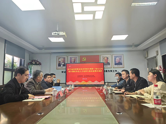 為推動中高職融合貫通,強化體系建設,12月8日,浙江安防職業技術學院應急技術學院院長涂嘉慶、安監專業負責人張于祥、安監專業專任教師武承哲、高順一行4人赴溫州市龍灣區職業技術學校研討中高職一體化人才培養方案。