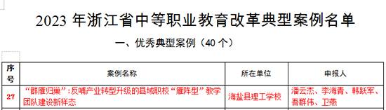 近日,浙江省教育科學研究院公布了2023年全省中等職業教育改革典型案例名單,確定2023年全省中等職業教育改革優秀典型案例40個,典型案例54個。海鹽縣理工學校《“群雁歸巢”:反哺產業轉型升級的縣域職校“雁陣型”教學團隊建設新樣態》師資隊伍建設典型案例成功入選2023年浙江省中等職業教育改革優秀典型案例。