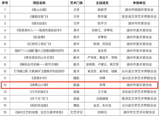 2023年度湖州市文聯(lián)文藝精品創(chuàng)作揭榜掛帥榜名單經(jīng)組織申報(bào)、資格審查、論證評(píng)審等程序,共產(chǎn)生16個(gè)入選項(xiàng)目,藝校李璟老師作品《綠青山小調(diào)》成功入選。