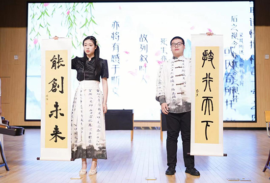 書法賽項2023年一等獎獲得者黃婧怡、2020年一等獎獲得者高家昊與鄞州職教中心古箏隊的同學們聯袂展示了《琴書合鳴話技能》。