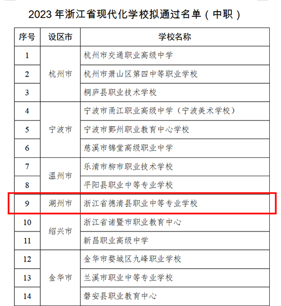 12月29日,浙江省教育廳、浙江省人民政府教育督導(dǎo)委員會(huì)發(fā)文公示了2023年浙江省現(xiàn)代化學(xué)校評(píng)估結(jié)果,德清職業(yè)中專成功上榜。2023年獲評(píng)的浙江省現(xiàn)代化中職學(xué)校中,全省共19所,湖州市僅1所。此次獲評(píng)是提升學(xué)校辦學(xué)品質(zhì)的又一標(biāo)志性工程,凝聚了全校師生、全體家長的努力和心血,也離不開社會(huì)各界的關(guān)心和支持。