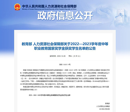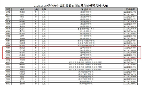 2023年12月末,教育部、人力資源和社會保障部發(fā)布了《2022—2023學年度中等職業(yè)教育國家獎學金獲獎學生名單》的公告,海寧技師學院5名學生獲得中職國家獎學金,截止目前海寧技師學院已共有25名學子獲得本項國家級殊榮。