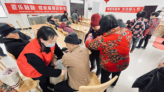 除了臘八粥和戲曲表演外,活動現場還設置了義診義剪服務。雙林醫院的志愿者為老年人們進行了測血壓等健康檢查,并為他們提供了健康咨詢。同時,理發師們也為老人們免費理發,讓他們在節日里煥發新顏。