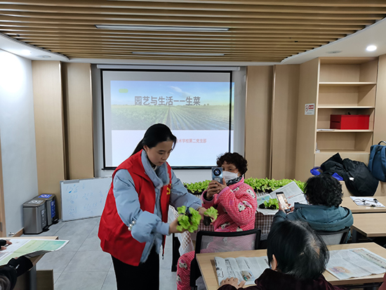 1月22日,湖州農校黨總支第一黨支部的楊勇老師、第二黨支部的徐婷婷老師來到湖州市星匯半島社區幸福鄰里中心,為社區居民開展《生菜栽培》的公益培訓活動。楊老師從生菜的生長習性、種苗繁育、生產應用、家庭園藝四個方面進行闡述,結合種苗盆栽,一一解答學員提出的日常實際問題,并傳授了一些種植小竅門。生菜諧音“生財”,楊老師和徐老師將湖州農校基地培育的生菜種苗贈送給居民學員,祝福學員“新年生財”。