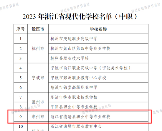 1月24日,浙江省教育廳、浙江省人民政府教育督導委員會正式發文公布了2023年浙江省現代化學校名單,德清職業中專成功上榜。2023年獲評的浙江省現代化中職學校中,全省共19所,湖州市僅1所。此次獲評是提升學校辦學品質的又一標志性工程,凝聚了全校師生、全體家長的努力和心血,也離不開社會各界的關心和支持。