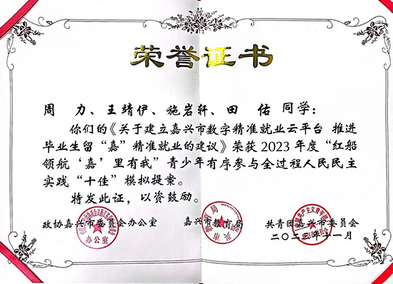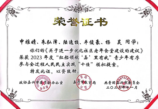 2023年以來,學校在推進青少年民主實踐過程中,建立起了由學生干部、團員青年為主要成員的學生民主實踐社團1個,校企共建德育實踐基地3個,開展了涉及食品安全、養老服務、招生就業等主題在內的專題調研、專題協商、民主監督活動10余次,參與學生1500余人次。學校選送的《關于建立嘉興市數字精準就業云平臺推進畢業生留“嘉”精準就業的建議》《關于進一步優化社區老年食堂建設的提案》兩個提案,在“紅船領航‘嘉’里有我”青少年學生優秀模擬提案評選中獲評市級“十佳”模擬提案。