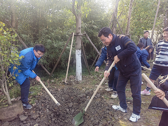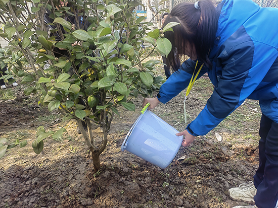 在園林專業(yè)老師的指導幫助下,同學們?nèi)艘唤M、五人一簇,“除草、挖土、固定、培土、澆水……”植樹現(xiàn)場一片熱火朝天的景象,處處洋溢著團結協(xié)作、奮發(fā)向上的青春氣息。