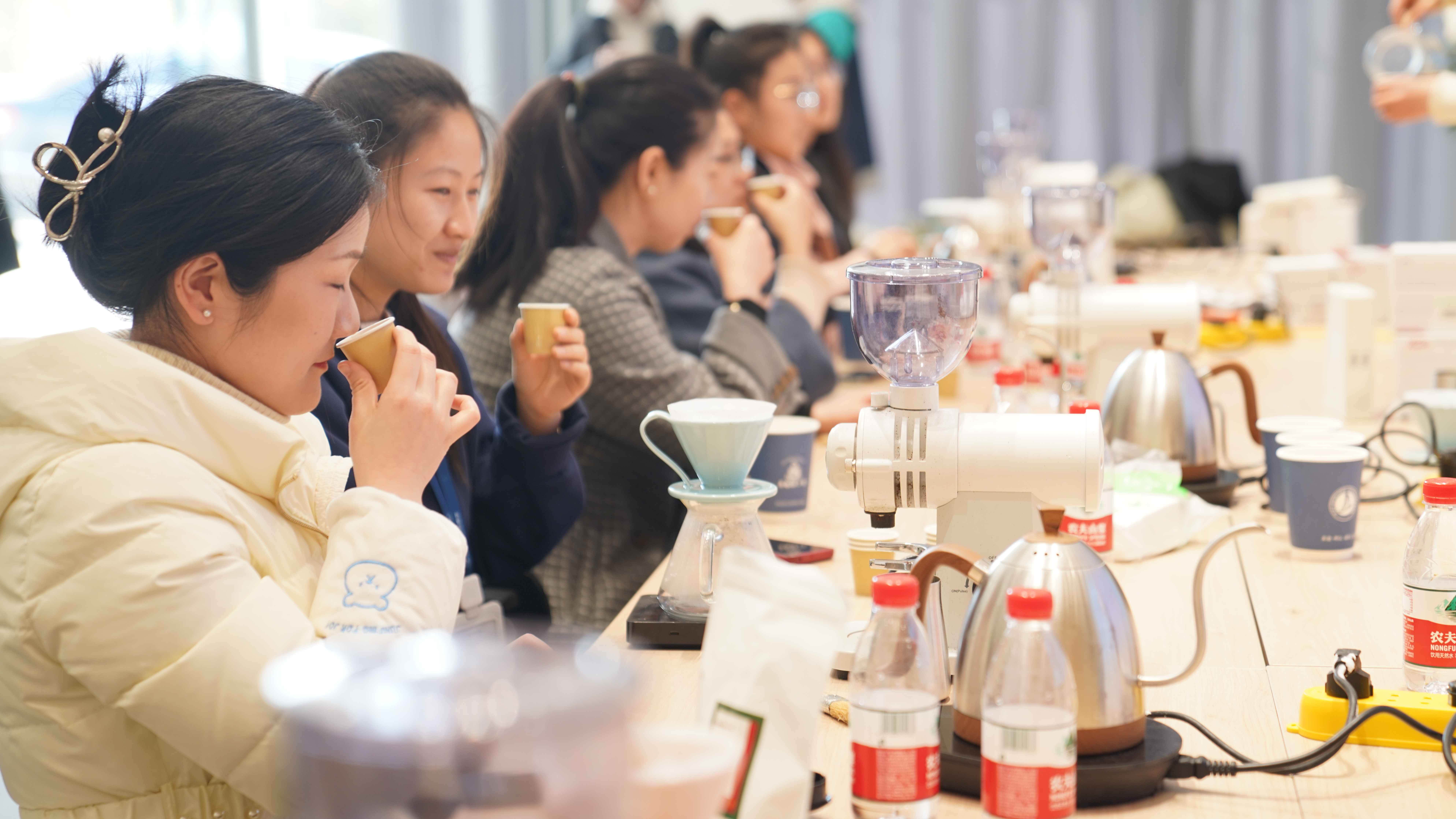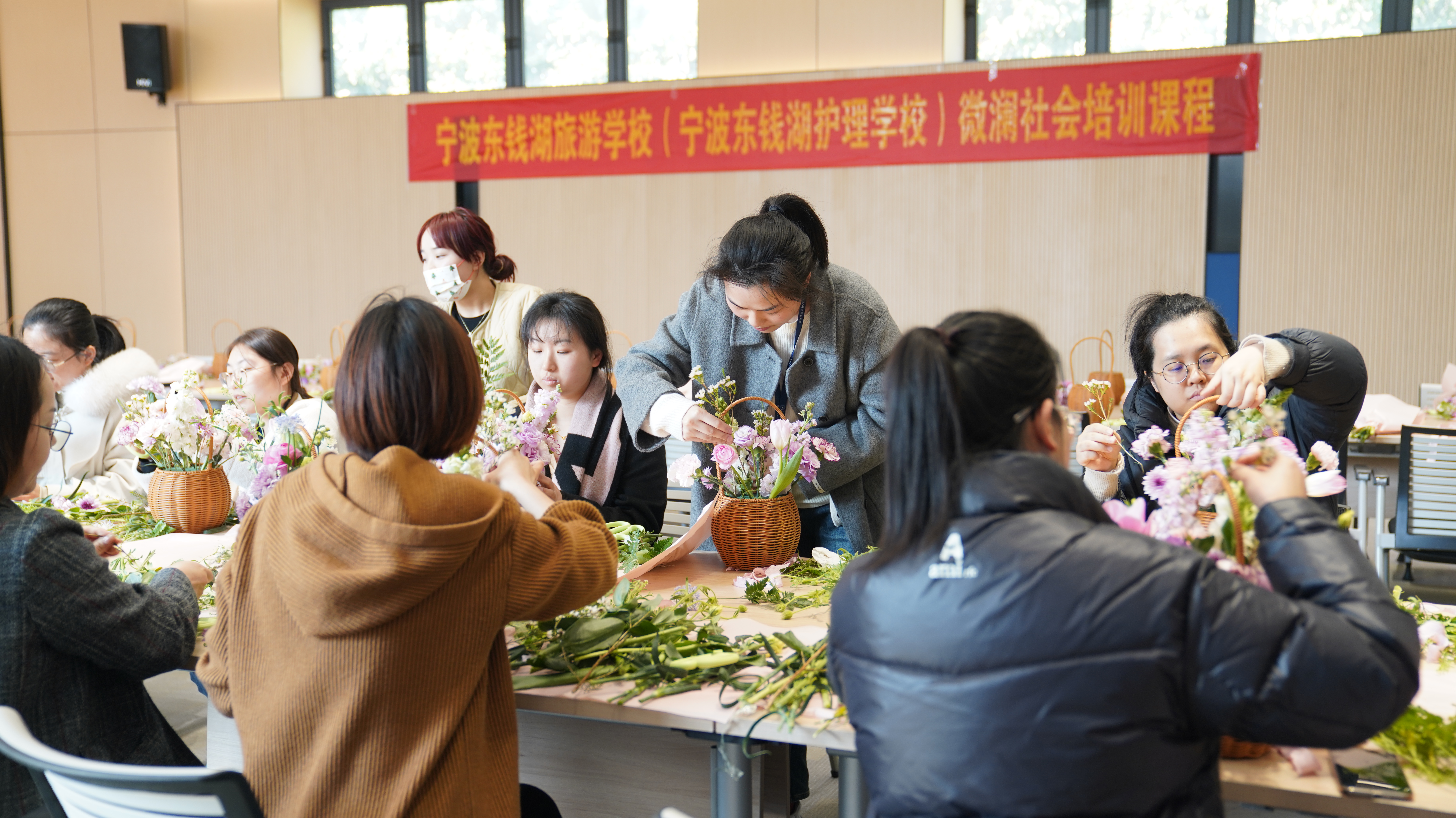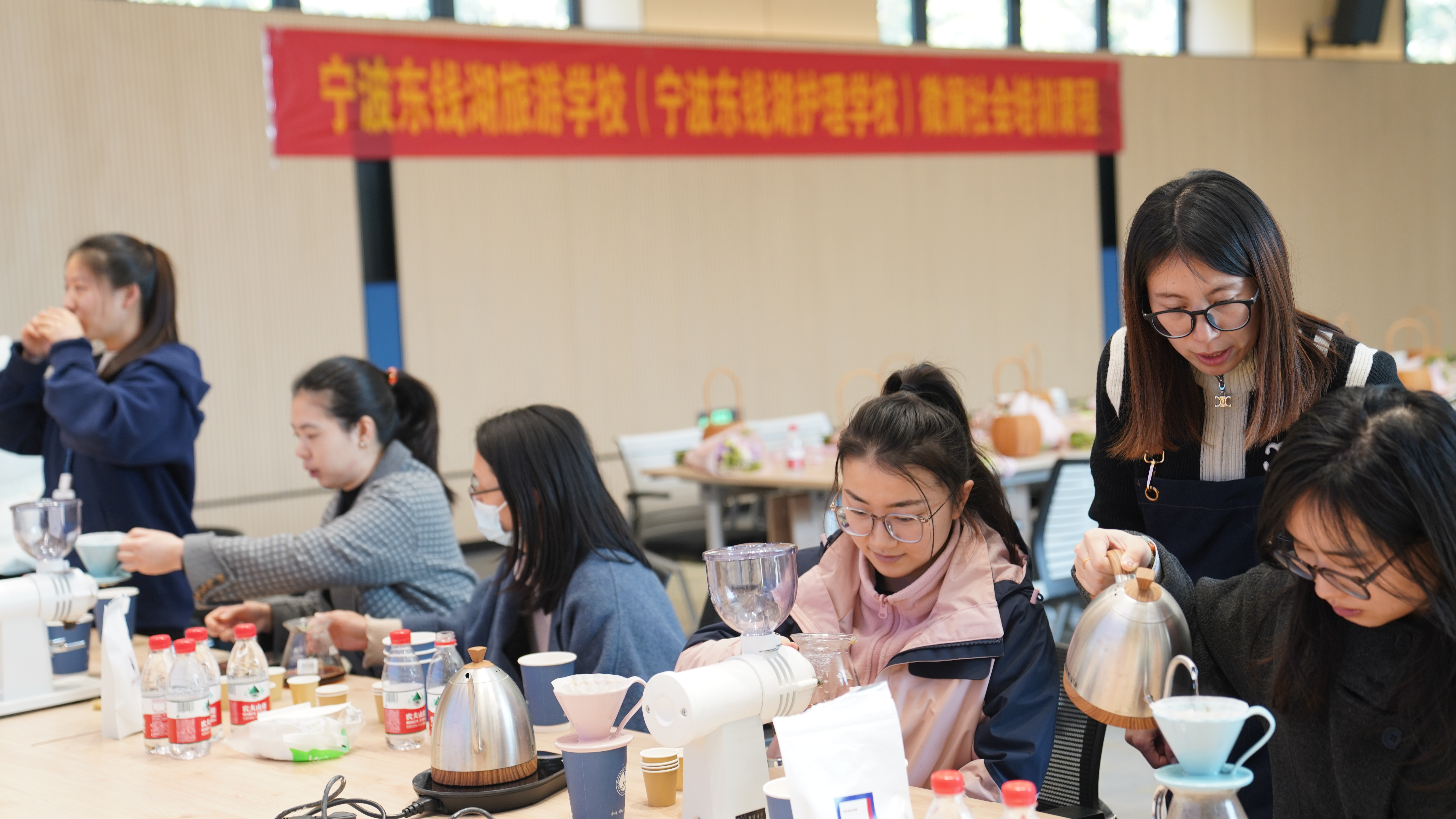 根據寧波甬江實驗室的實際需求,該校量身定制了手沖咖啡和花藝培訓項目,既有理論學習,也有實踐操作。手沖咖啡實操環節,伴隨著“嗞嗞嗞”的聲響,一顆顆金色的咖啡豆子化作粉末,濃濃的咖啡香彌漫教室?;ㄋ嚺嘤栔?,大家沉浸于唯美的花藝世界,一枝枝鮮花經過巧手搭配,造型別致的插花作品驚喜出品。