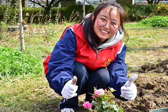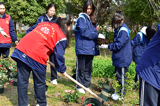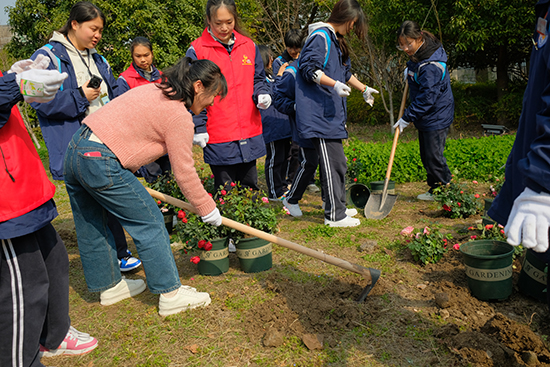 暖陽正好,春風(fēng)徐徐,同學(xué)們在團(tuán)委老師們的指導(dǎo)下,三五一組,分工合作,配合默契,揮鍬鏟土,提水澆灌。