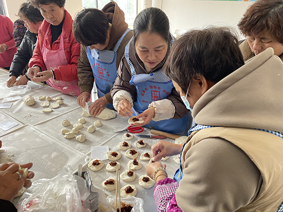 在三墩村老年學(xué)堂,一個(gè)個(gè)花式面包、多彩水餃、雪媚娘、餅干、蛋撻等,在阿姨們的巧手下紛紛呈現(xiàn),看著她們開心地品嘗著自己的勞動(dòng)成果,那真叫一個(gè)幸福。