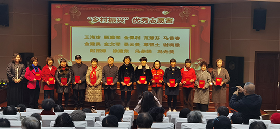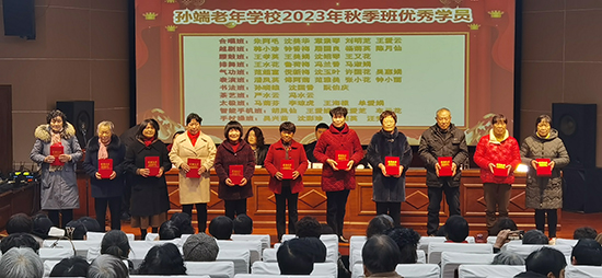 開學典禮在莊嚴的國歌聲中拉開序幕。王雪丹宣讀關于孫端街道老年學校2023年(秋季班)“鄉村振興”優秀志愿者、才藝獎、優秀學員的表彰文件。在過去的2023下半年中,14位學員在助力“文化賦能 鄉村振興”行動中表現突出,36位學員在各級各類比賽活動中取得優異成績,另有45位學員在日常學習期間表現優秀。王丹委員,王招麗委員,車軍妍副局長分別為其頒獎。獲獎代表表示,將繼續在孫端老年學校發揮自己的余熱,與同學們共享“老有所學,老有所樂,老有所為”的老年生活。
