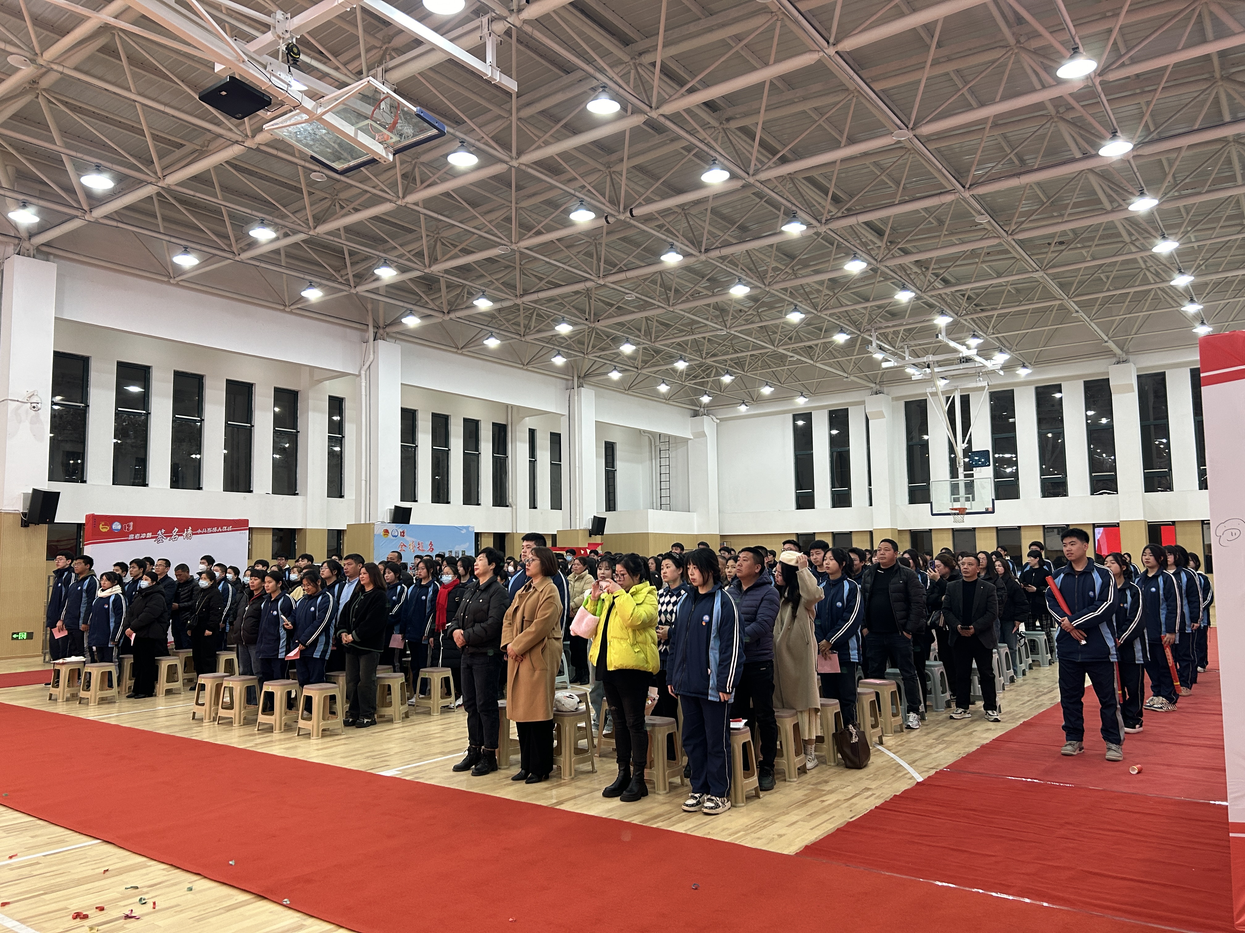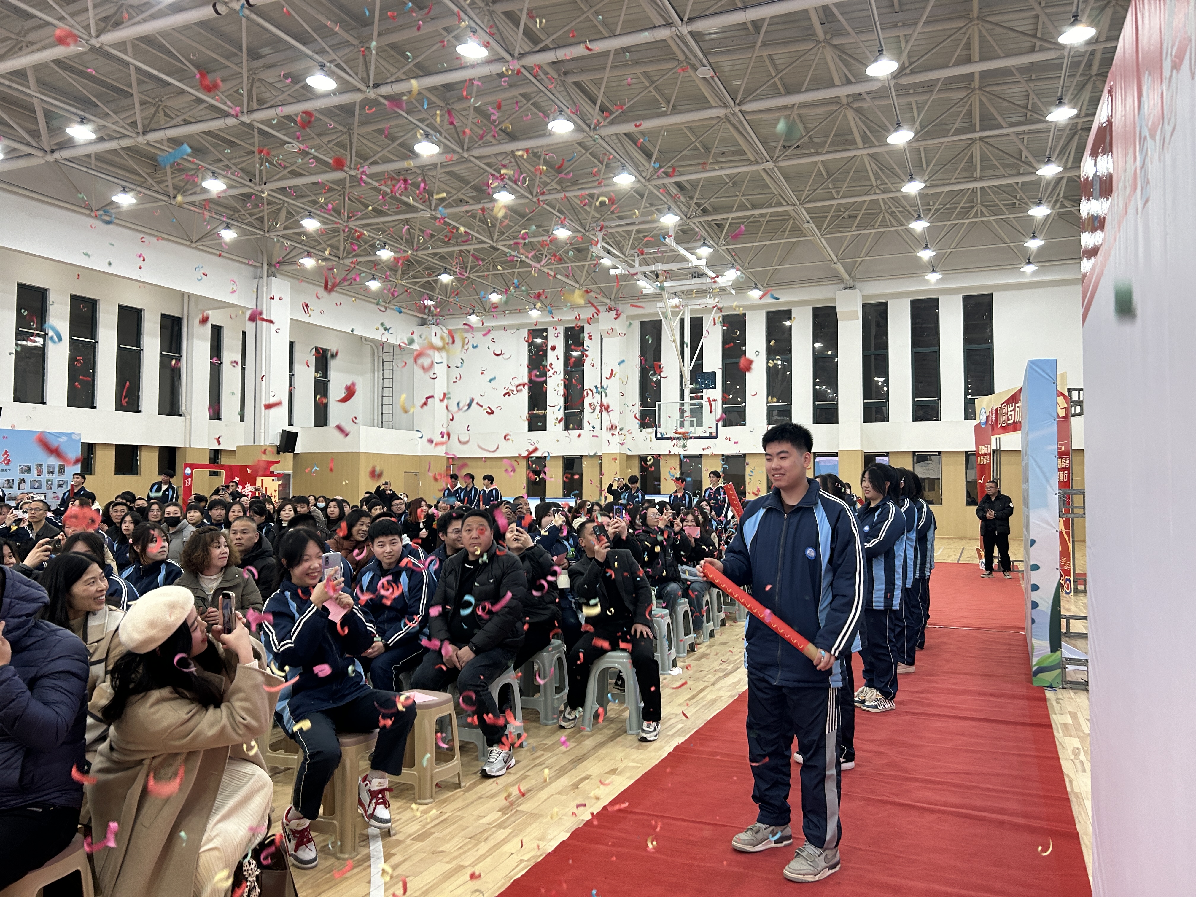 在老師、家長(zhǎng)的陪同中,同學(xué)們昂首踏上紅地毯,跨越成人門,滿懷豪情地迎接屬于成人的榮光。他們?cè)诔扇藟︵嵵睾炆献约旱拿郑脤?shí)際行動(dòng)備戰(zhàn)高考,用責(zé)任擔(dān)當(dāng)書寫青春答卷。