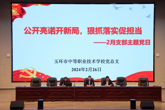 近日,玉環(huán)市中等職業(yè)技術(shù)學(xué)校黨總支組織全體黨員在學(xué)校大報告廳開展“公開亮諾開新局,狠抓落實促擔當”主題黨日活動。會議由玉環(huán)市中等職技校黨總支副書記、校長吳德章主持。