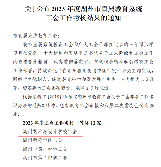 近日,湖州市教育工會八屆二次委員(擴大)會議順利召開,會上表彰了湖州市直屬基層教育工會工作考核一等獎的12家工會,浙江省湖州藝術與設計學校工會在眾多考核單位中位列第一。