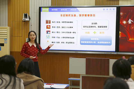 浙江商貿(mào)學校劉楊老師創(chuàng)設文旅宣傳情境,引導學生運用方法論,堅持具體問題具體分析;永康職業(yè)技術學校徐椰老師以“一個電影素材”“兩大議題情景”“三大學生活動”展示了《建設法制中國》課堂教學。