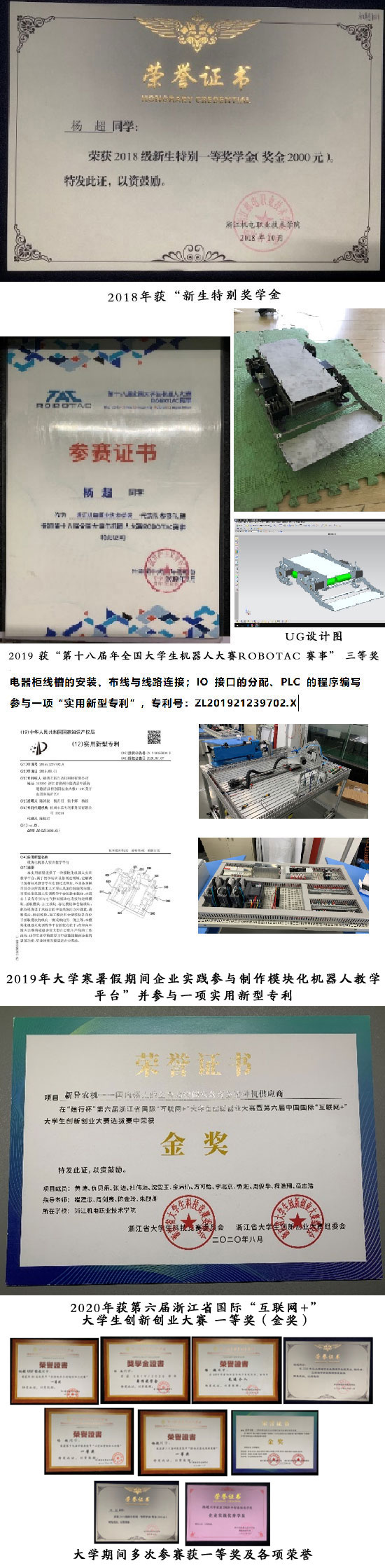 國賽一等獎讓楊超獲得了大學(xué)免試入學(xué)的機(jī)會,隨后,他進(jìn)入浙江機(jī)電職業(yè)技術(shù)學(xué)院進(jìn)行深造。大學(xué)期間,仍舊積極參加各類比賽,取得了不錯(cuò)的成績。在大學(xué)寒暑假期間,還積極參加企業(yè)實(shí)踐,發(fā)揮了專長優(yōu)勢,為企業(yè)做出了貢獻(xiàn),并取得了一定成果。